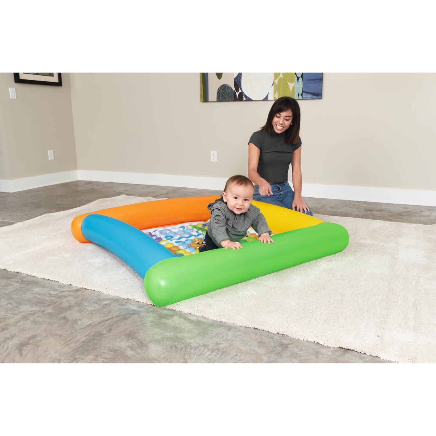 ¡Diseñado para que los más pequeños se muevan y jueguen, ha sido probado en calidad y se enfoca nuevamente en la diversión! El Play Mat ofrece un gran lugar para el juego imaginativo de su pequeño. Construido con vinilo resistente probado previamente, este tapete de juego de colores brillantes cuenta con un piso suave e inflable para la comodidad del bebé. El piso colorido tiene cuatro paredes laterales suaves e inflables para mantener al bebé seguro mientras juega. ¡Jugar nunca ha sido más divertido!