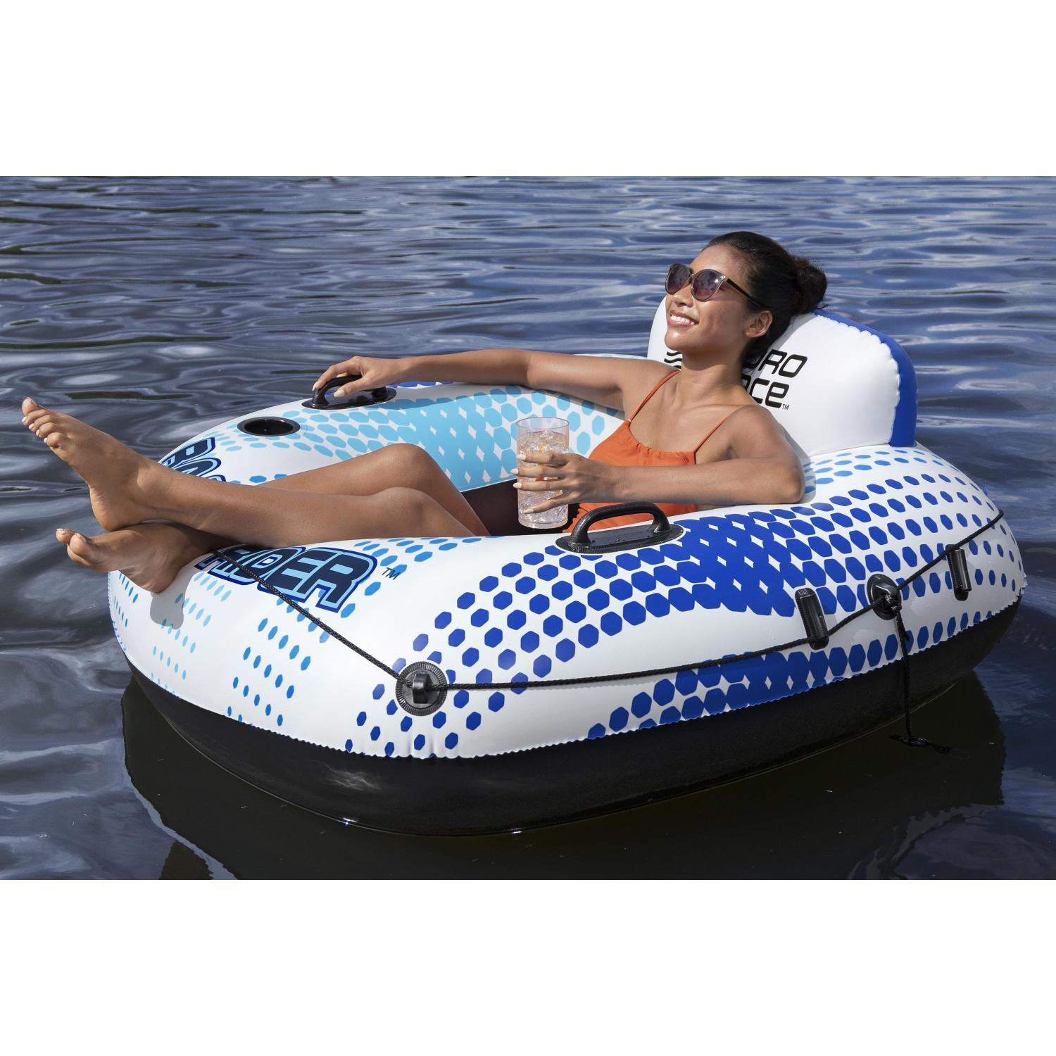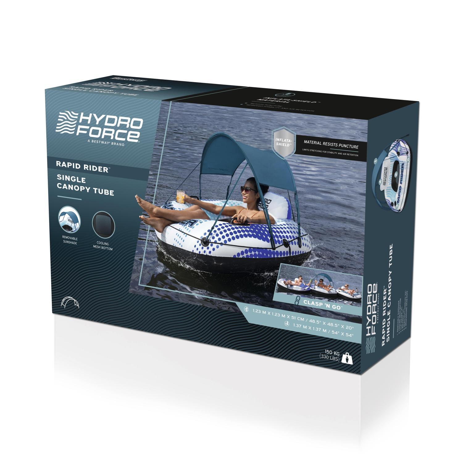 El Hydro-Force™ Rapid Rider™ Canopy Tube es la manera perfecta de disfrutar de la diversión relajante bajo el sol y en el agua. Este resistente flotador para lagos y ríos tiene capacidad para un adulto y está fabricado con material Inflata-Shield™, resistente a las perforaciones y que limita el estiramiento para una mejor retención de aire. También cuenta con un parasol extraíble para protegerse de los fuertes rayos del sol. Incluye un portavasos integrado para tener a mano tu bebida favorita, y sus asas resistentes te ayudarán a subir y bajar del flotador con facilidad. Relájate en el agua con la comodidad adicional que te ofrece el asiento de malla fresca especialmente diseñado y el respaldo premium. Además, una cuerda de agarre rodea todo el flotador para mayor seguridad y facilidad al atracar, o puedes conectarlo con otros flotadores usando los dos ojales para las hebillas Clasp 'N Go™, que conectan fácilmente dos flotadores. ¡Así que ponte tus gafas de sol y protector solar y disfruta de la aventura con el Hydro-Force Rapid Rider Canopy Tube!