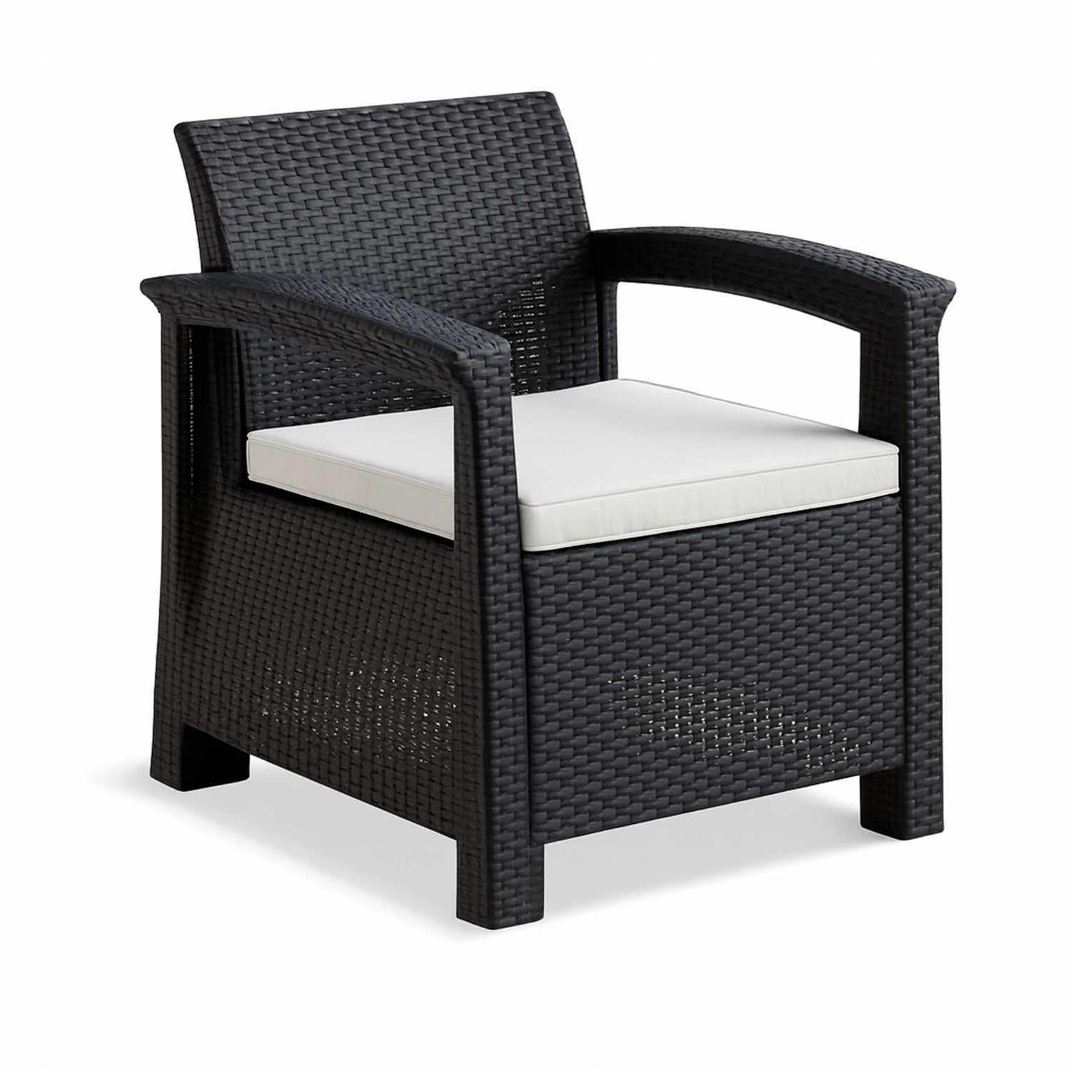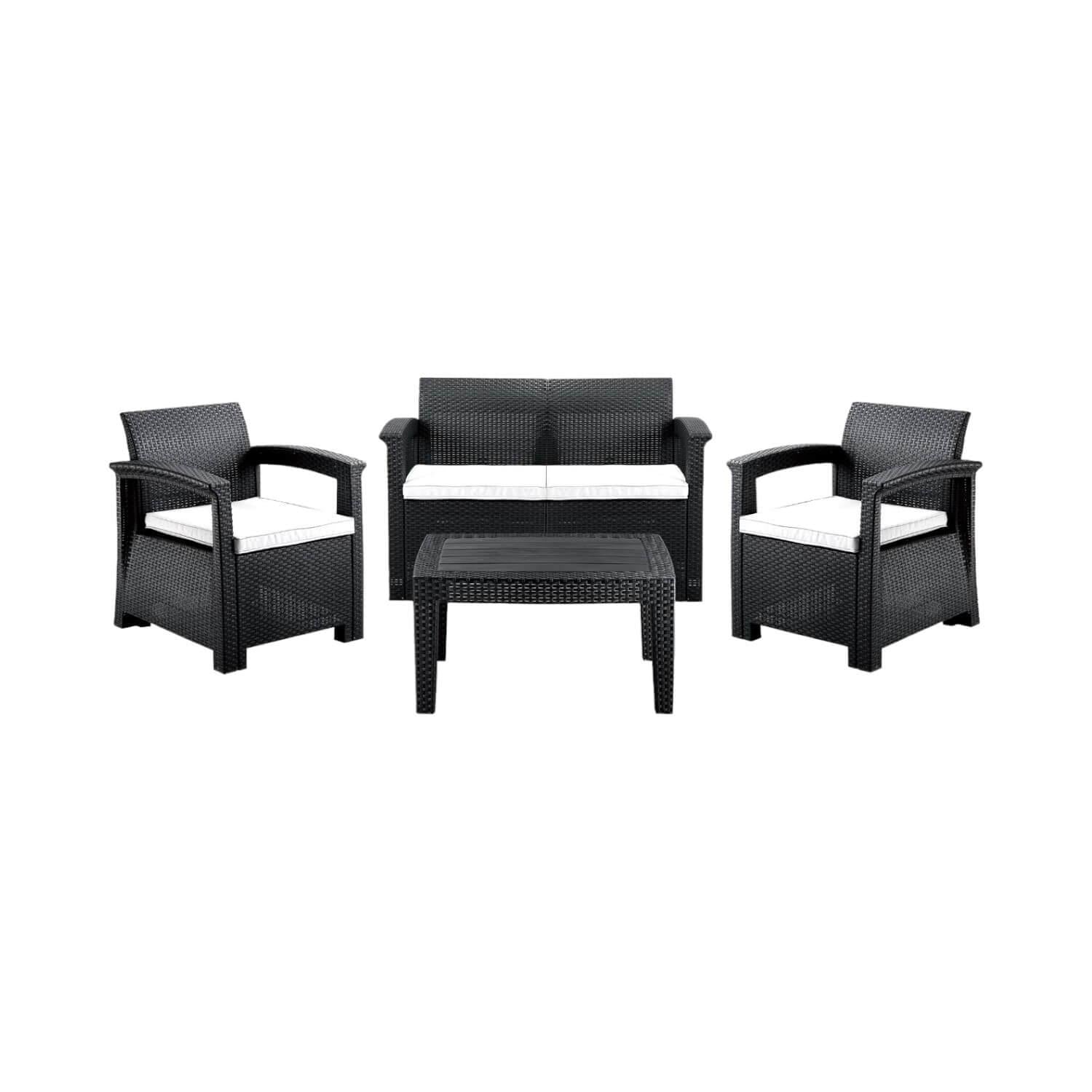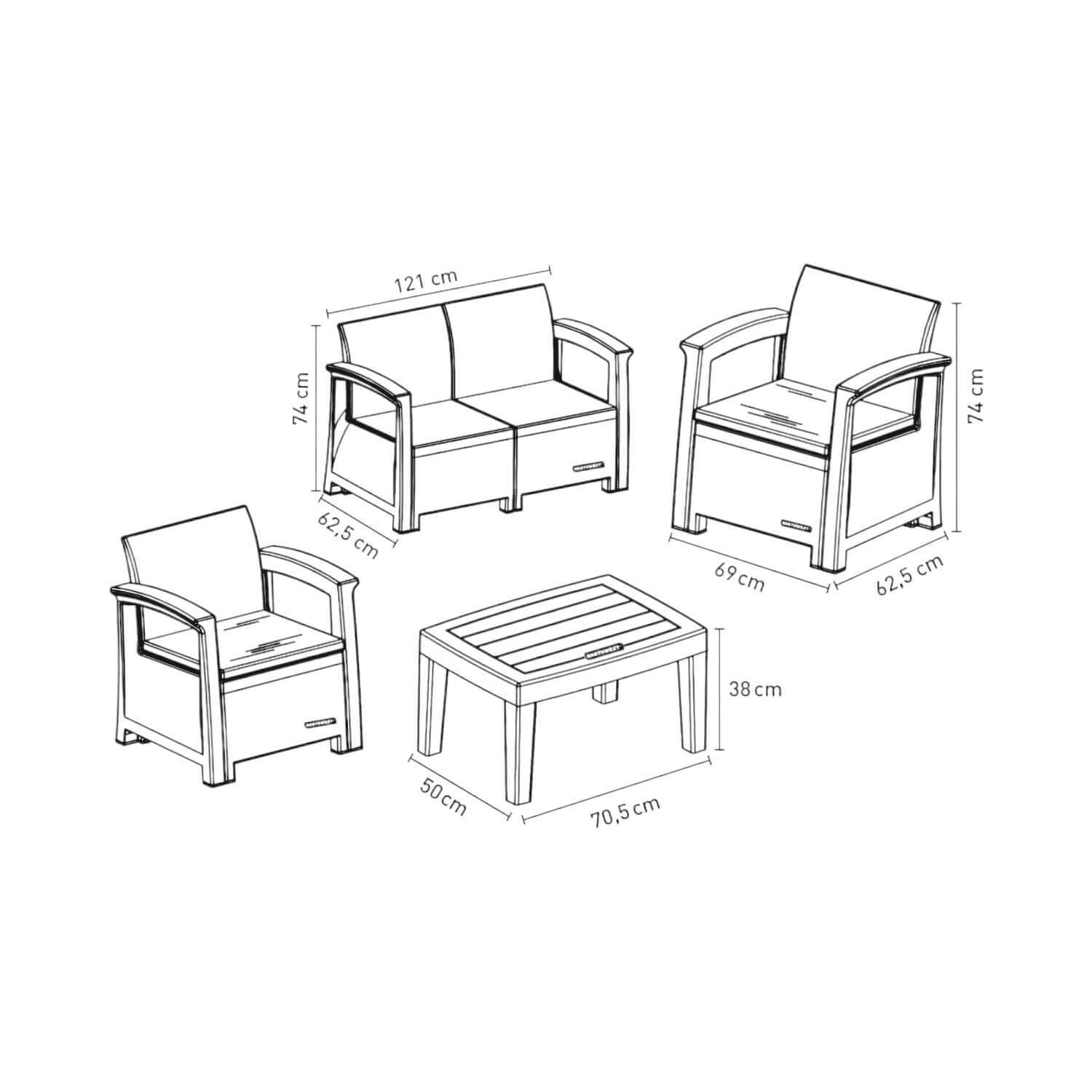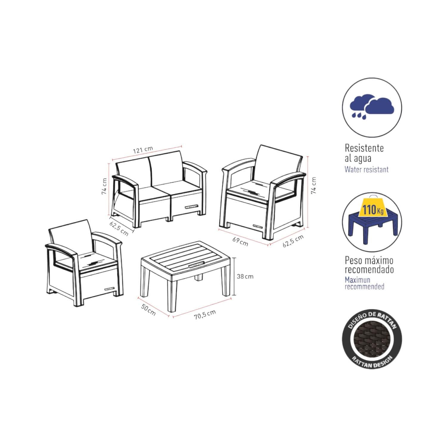 • Incluye: 2 sillones, 1 sillón 2 cuerpos con cojines de poliéster y 1 mesa