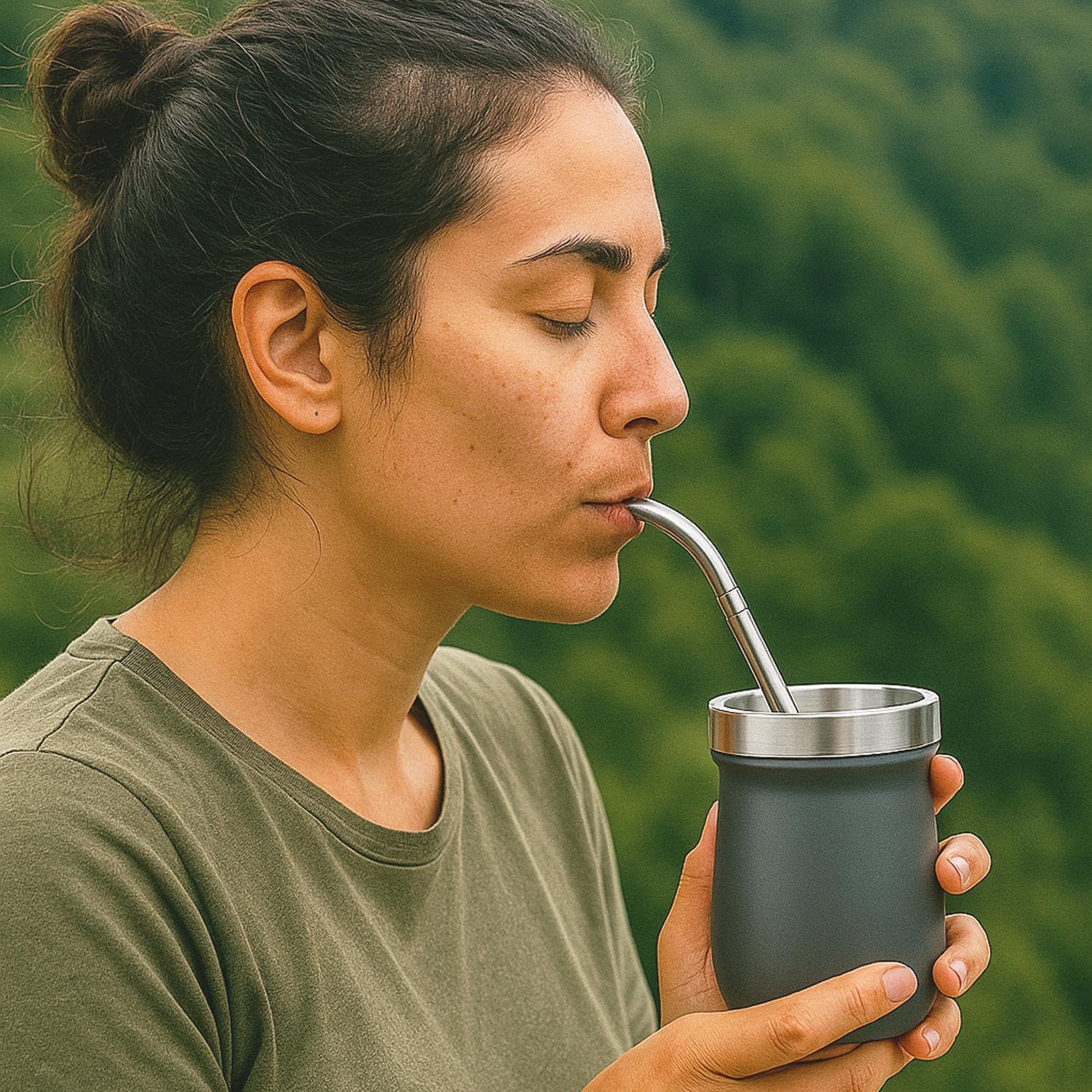 Fabricada en acero inoxidable de alta calidad, esta matera ofrece una excelente conservación de la temperatura y una resistencia superior frente al uso diario. Su superficie gris de acabado elegante no solo aporta estilo, sino también facilidad de limpieza y durabilidad frente a golpes o caídas accidentales.