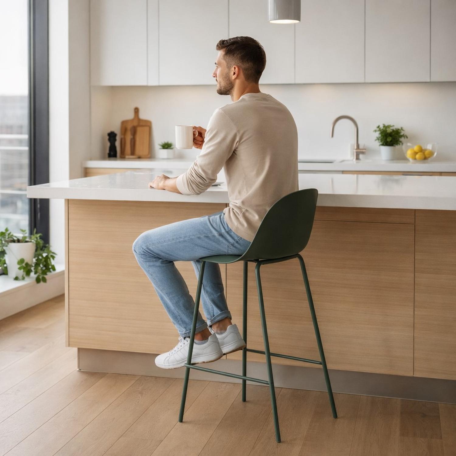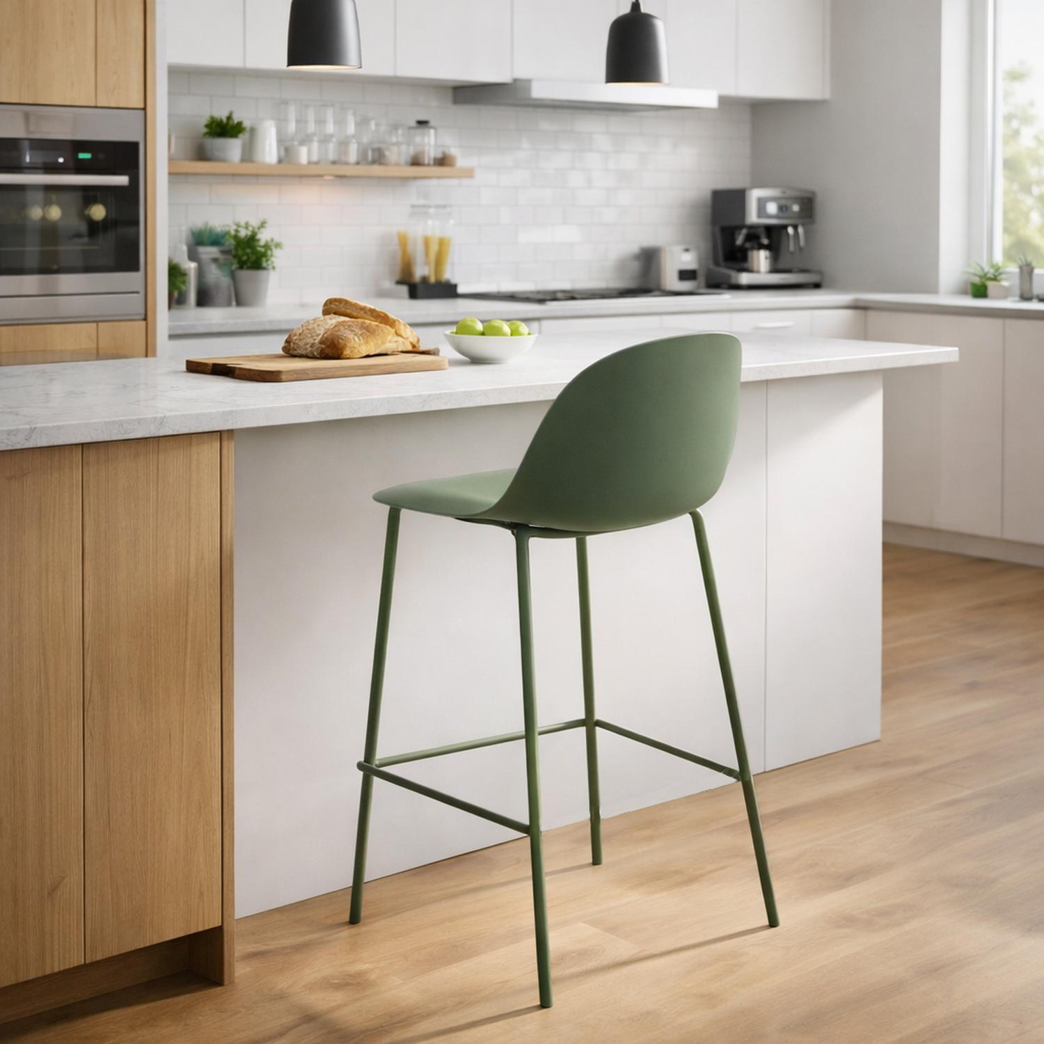 Aporta un estilo elegante y natural a tu cocina, bar o comedor con el taburete Eira en color verde oscuro. Su tonalidad profunda transmite sofisticación y calidez, ideal para crear ambientes modernos y con personalidad. Perfecto para barras de cocina, islas o mesas altas, combina diseño y funcionalidad en una sola pieza.
