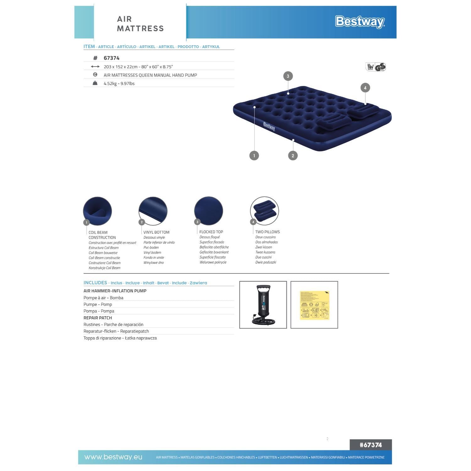 - Contenido: 1 colchón de aire, 2 cojines, 1 bomba de aire, parche de reparación