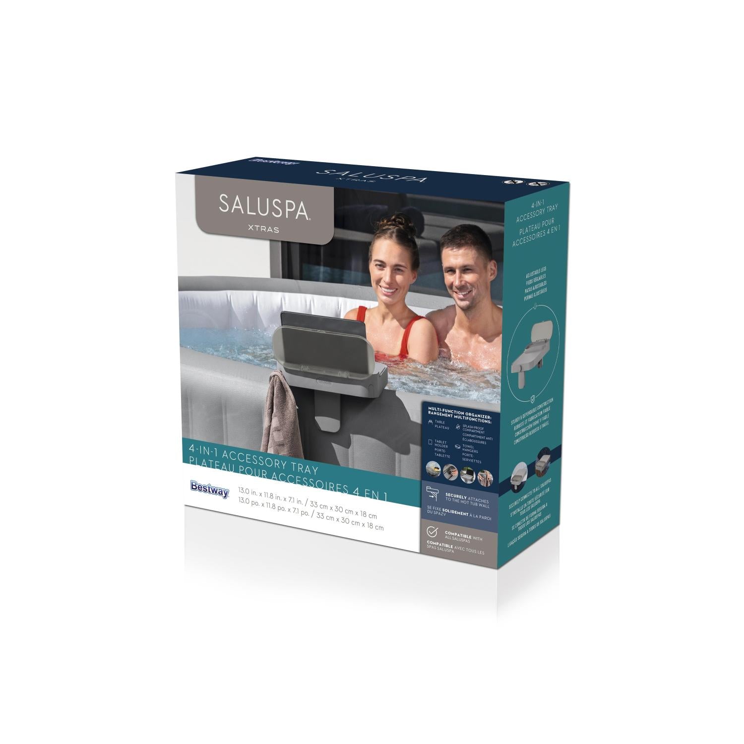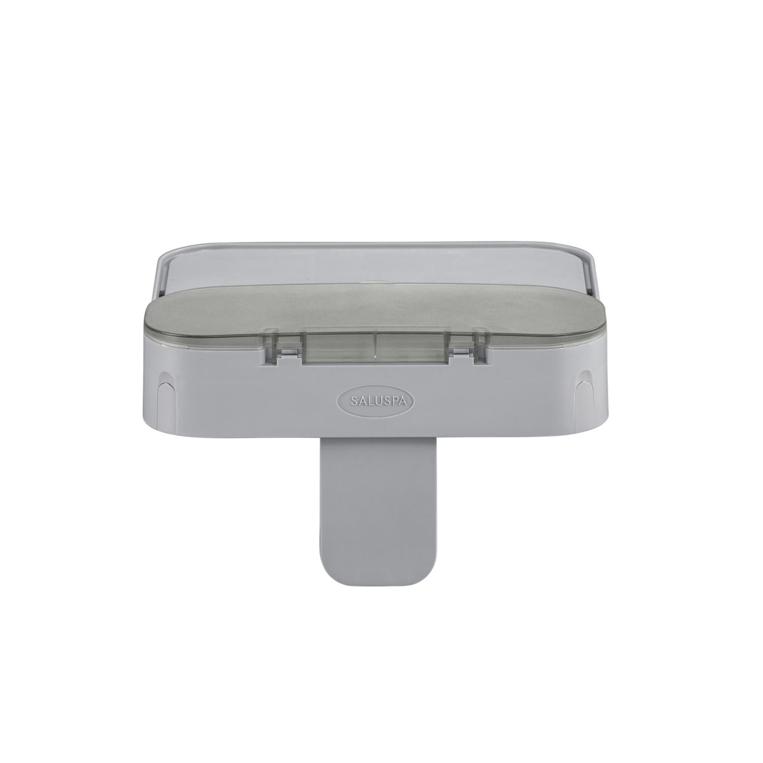 ¡Guarda todos tus accesorios favoritos para spa en un lugar práctico y de fácil acceso con la bandeja para accesorios 4 en 1 de SaluSpa®! Con una mesa, un compartimento a prueba de salpicaduras, colgadores para toallas y un soporte para tableta, puedes relajarte con todo lo que necesitas a un paso. Mantén tus bebidas o refrigerios favoritos cerca mientras disfrutas de una película o música en tu tableta. Al terminar la noche, toma tu toalla y abrígate antes de salir de la bañera. La bandeja para accesorios 4 en 1 es compatible con todos los modelos de SaluSpa e incluye una pieza ajustable que te permite colocarla en el lugar que prefieras en cualquier pared del spa.