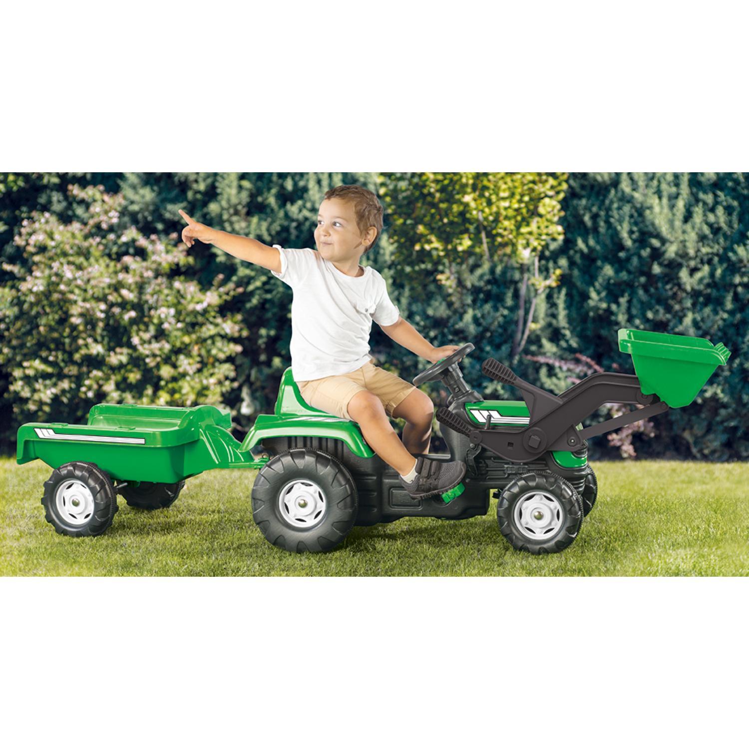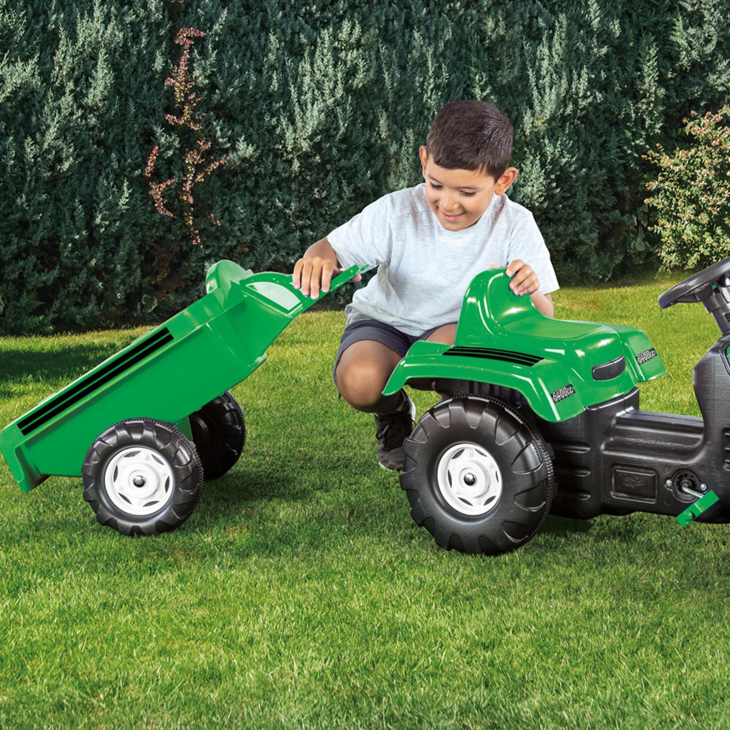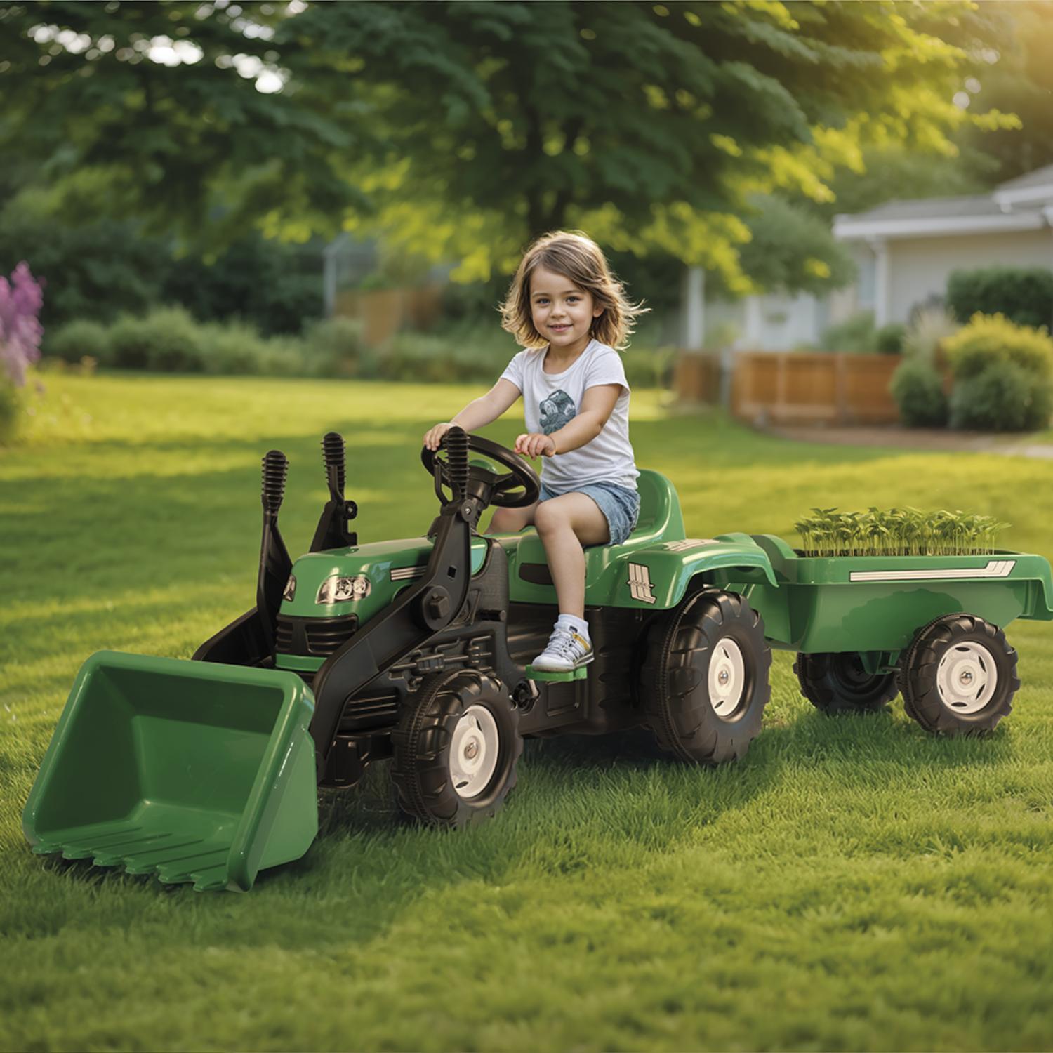 Con sus grandes dimensiones de 52x171x45 cm, este tractor tiene todo para la diversión: un remolque para llevar lo que quiera, pedales para que se mueva por sí solo, y una bocina para avisar a todos que va en camino. Además, incluye una pala, lo que lo hace ideal para jugar con arena o tierra. Es perfecto para usar tanto adentro como afuera de la casa.